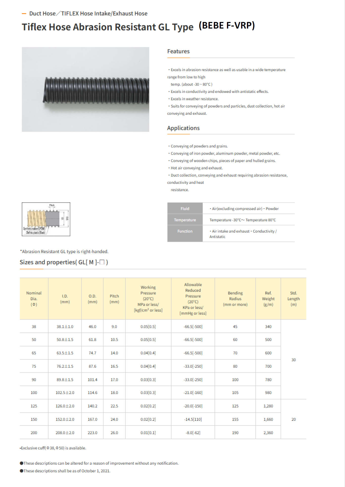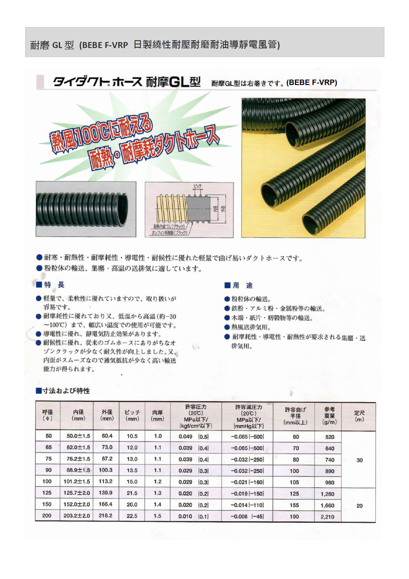 以耐正壓負壓力,耐磨耗'耐油'耐酸鹼高導靜電'防爆耐溫'特殊EP活性合成高彈性橡膠片融貼於耐化性硬質螺旋型粗PP條內,呈內部平順'耐化性,適用於耐正'負壓真空製程'粉塵'研磨'屑